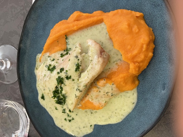 Filet de Lieu sur purée de patate douce et crème de persil ou sauté d'épaule d'agneau et riz pilaf